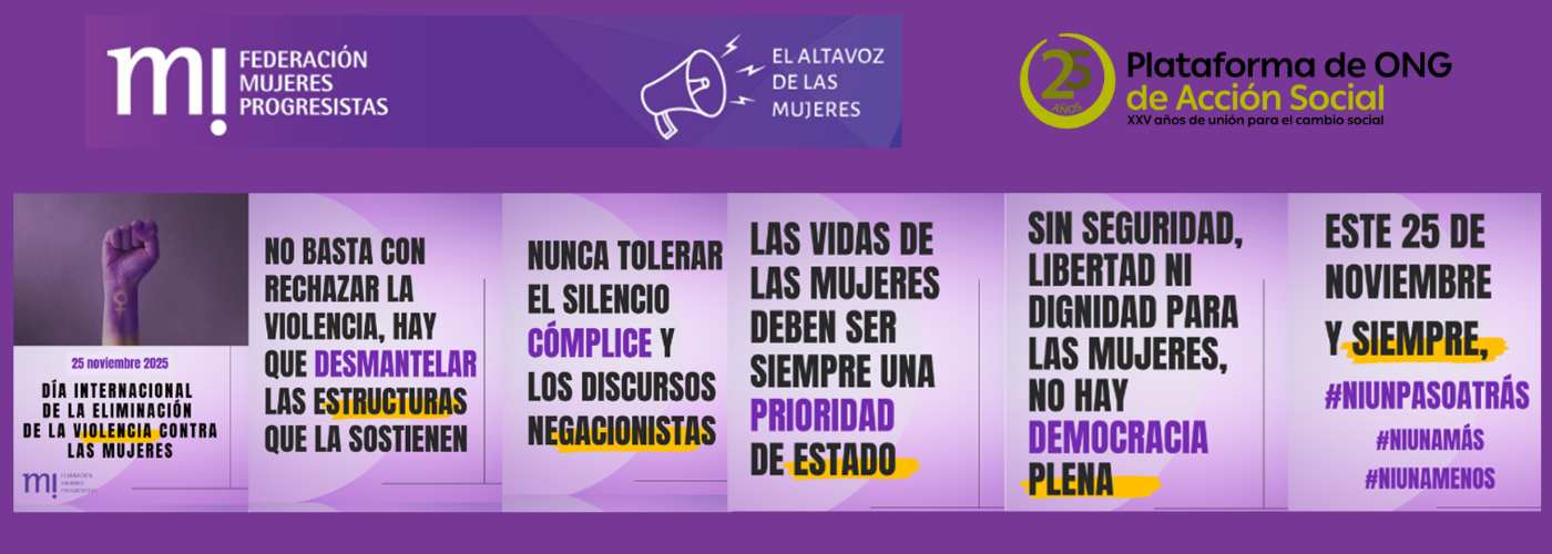 La Plataforma de ONG de Acción Social se suma un año más y comparte este 25 de noviembre, Día Internacional de la Eliminación de la Violencia contra la Mujer, el manifiesto de la Federación de Mujeres Progresistas (FMP), apoyando además todos los proyectos que llevan a cabo las entidades sociales la erradicación de la violencia de género.