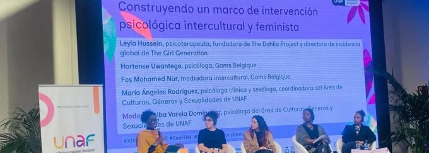 Leyla Hussein, fundadora de The Girl Generation, señaló la importancia de garantizar a las mujeres un espacio seguro y en “co-creación” con ellas. Hortense Uwantege, psicóloga de GAMS Bélgica, consideró imprescindible la mirada intercultural en la relación terapéutica: “Hay que escuchar a la persona en su ambigüedad entre el país de origen y de destino. Por eso es necesario que las y los profesionales estemos formados en aspectos interculturales”. Mª Ángeles Rodríguez, psicóloga y sexóloga, coordinadora del Área Culturas, Géneros y Sexualidades en UNAF, añadió que la intervención debe estar centrada en las violencias de género contra las mujeres, y tener un enfoque antirracista y comunitario.