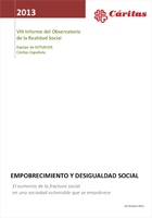 El VIII Informe del Observatorio de la Realidad Social de Cáritas constata principalmente situaciones y hechos que nos interpelan sobre el empobrecimiento de la sociedad y el riesgo de fractura social que, más allá de la coyuntura de la crisis, están suponiendo la consolidación de una nueva estructura social donde crece la espiral de la escasez y el espacio de la vulnerabilidad.